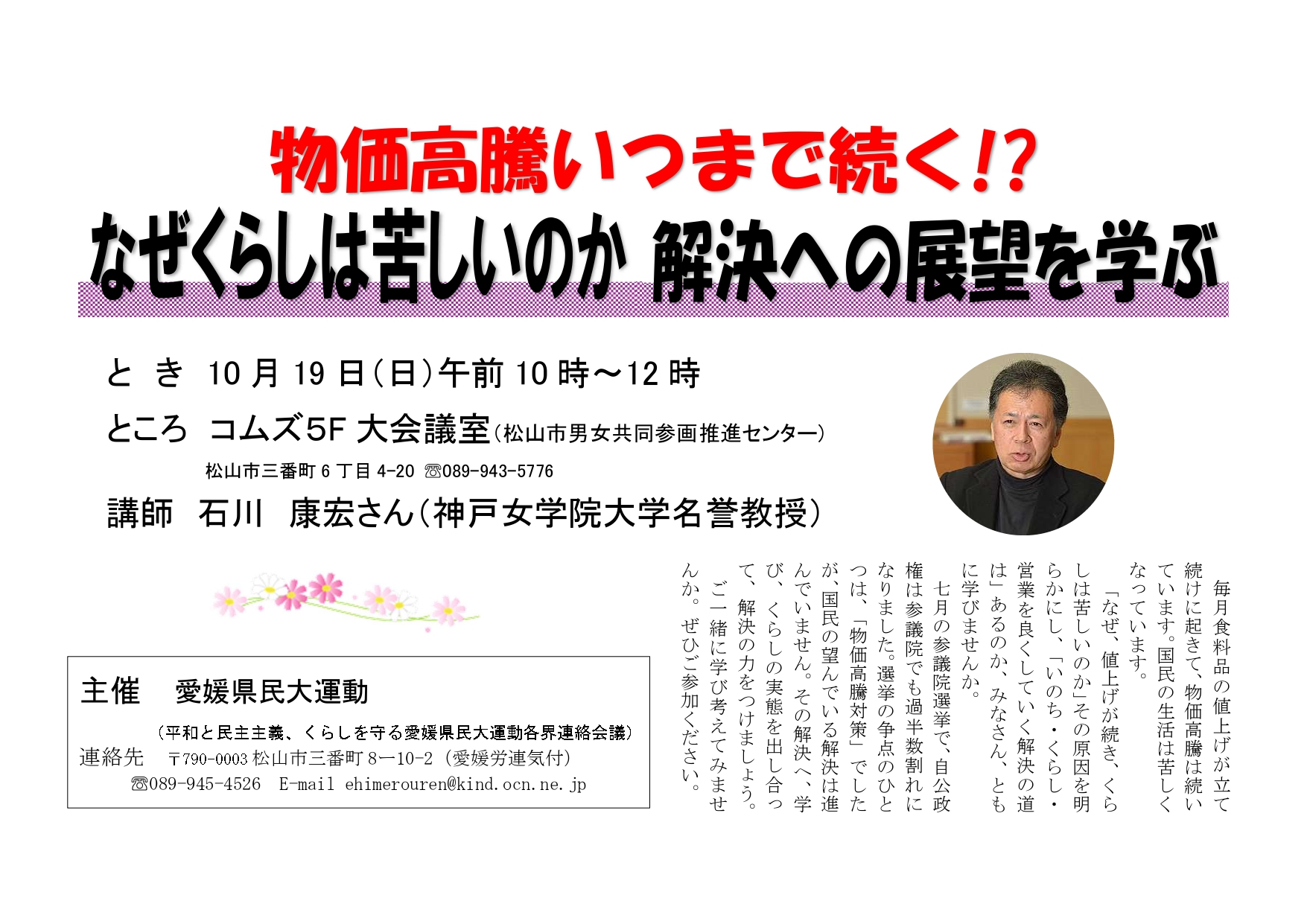 10/19 物価高騰いつまで続く!?なぜ暮らしは苦しいのか 解決への展望を学ぶ 石川康宏学習講演会 イベント案内 2025.09.18 日時 10月19日(日)10時~12時 会場 コムズ5F大会議室(松山市男女共同参画推進センター) 講師 石川康宏さん(神戸女学院大学名誉教授) 参加費 無料 主催 愛媛県民大運動(平和と民主主義、くらしを守る愛媛県民大運動各界連絡会議)