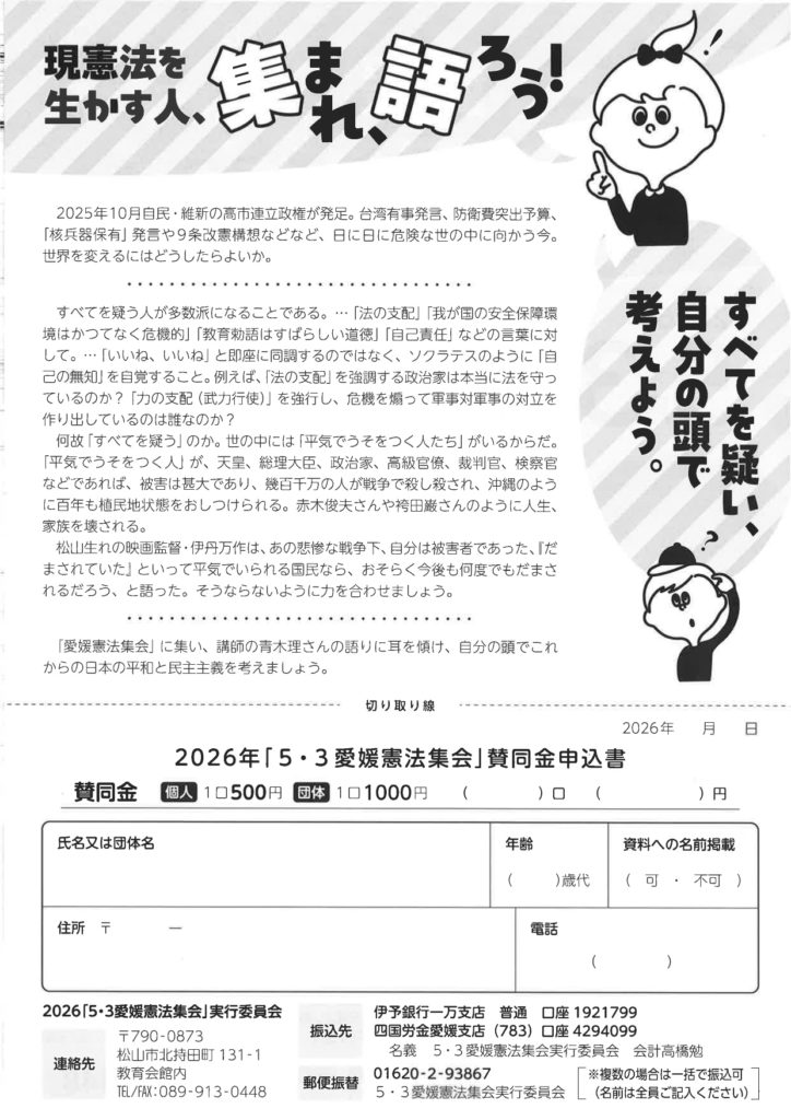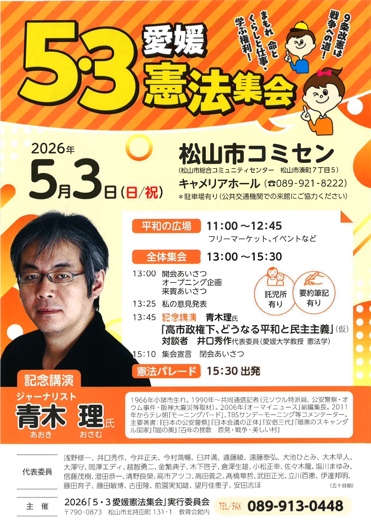5/3 5・3愛媛憲法集会 イベント案内 2026.04.03 日時 5月3日(日・祝)平和の広場11:00~12:45 全体集会13:00~15:30 会場 松山市コミュニティセンター キャメリアホール 記念講演 「高市政権下、どうなる平和と民主主義」青木 理さん(ジャーナリスト)と井口秀作さん(愛媛大学教授)との対談 主催 2026[5・3愛媛憲法集会」実行委員会